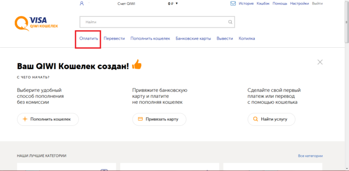 В QIWI всё выглядит несколько иначе, одна здесь вы можете оплачивать прямо со счета своего телефона. Сделайте свой аккаунт и пополните телефон на необходимую сумму для оплаты газа. Зайдите в раздел “Оплатить”.