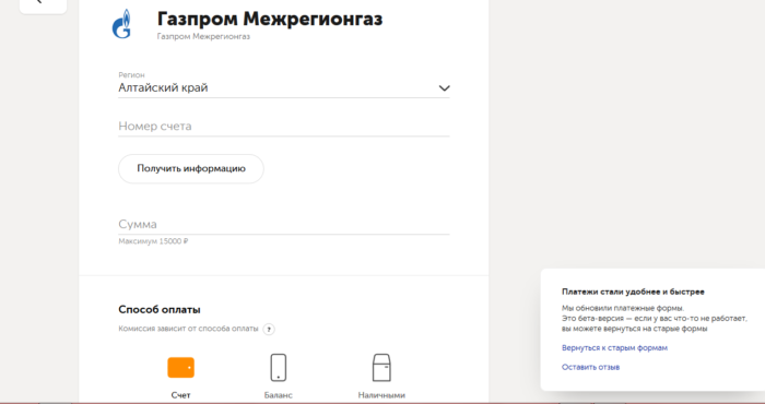 Введите свой регион, номер лицевого счета и сумму в рублях. Способ оплаты доступен как с телефона, так и с банковской карты. Подтвердите действие, и средства спишутся.