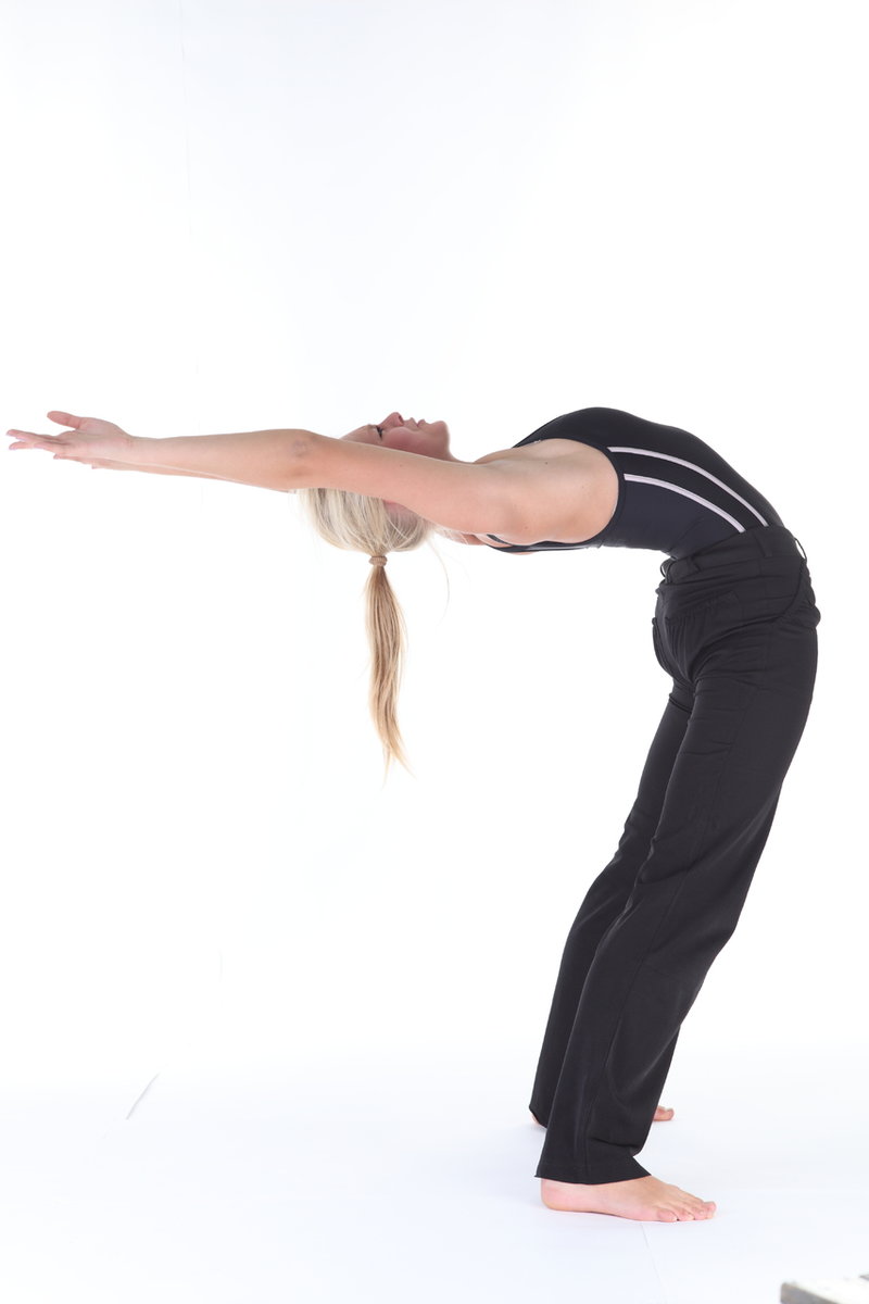 В положении стоя прогибаются назад к пояснице. Сначала занимают стойку с широко расставленными ногами (шире плеч), носки смотрят прямо. Ладони размещают сзади на пояснице. Тянутся назад и вниз, нацеливая ребра и лобковую кость вверх. Максимально опустившись, задержаться на 30 сек.
